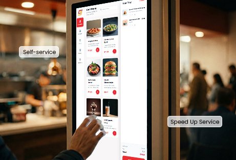 - Guests place orders independently via touch-screen kiosks.